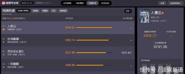截止10月10日10时18分,从“猫眼专业版”实时数据显示可知,当前热播电视剧中,网播热度最高的五部剧分别如下: 1、《入青云》 主演:侯明昊/卢昱晓/余承恩 剧情点评:本来只想随便找部剧下饭,结果被《入青云》按头真香——这剧可不只是简简单单拍传统仙侠,明明是把“国风美学”焊在镜头里,连男女主拉扯对抗的戏份都蛊到我想暂停截图发朋友圈,妆造、画面质感、剧情方方面面都是T0级别,拯救剧荒大恩人!而且与传统古侠剧稍微不同,题材较为新颖,妆造方面也很好,女主的人设我很喜欢,非常可爱灵动,妆造堪称一绝,卢昱晓颜值太拿得出手了,男主侯明昊也是帅的没边了,妥妥古风小生变身蛊风小生,越播到后面会越吸引人,个人觉得《入青云》会爆火的,话不多说,看剧!